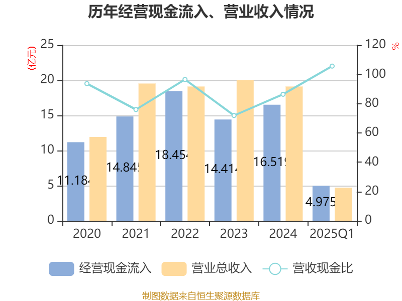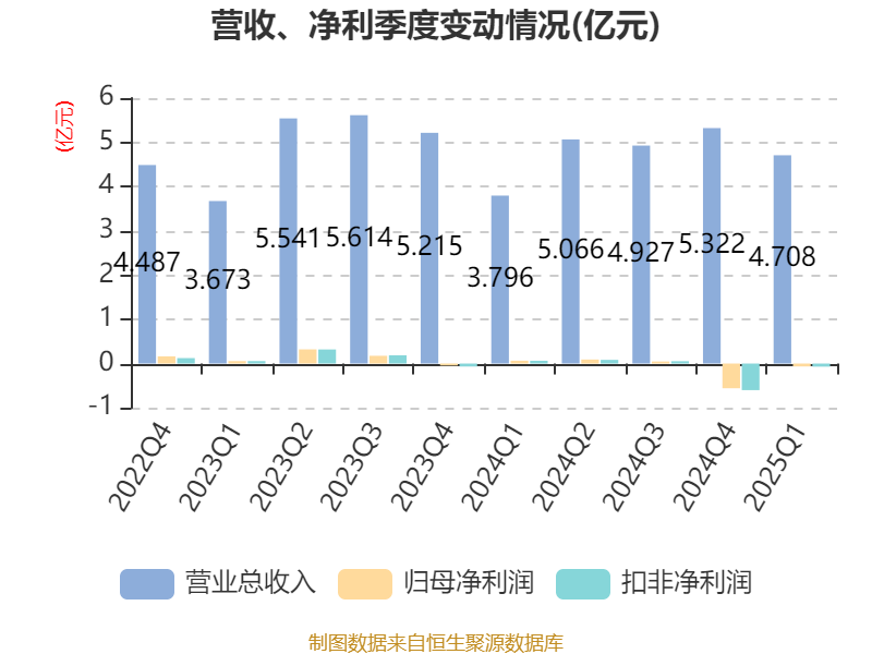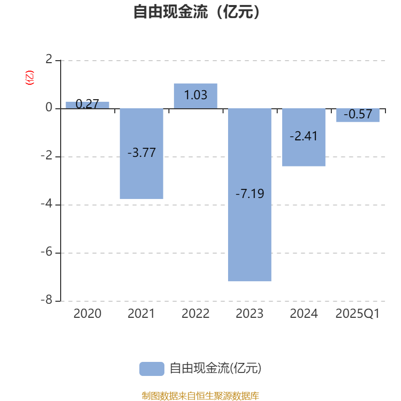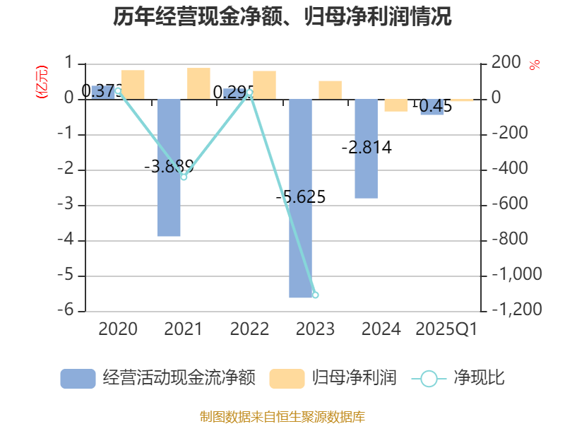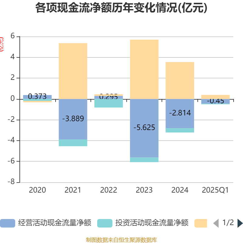 截至2025年一季度末,公司经营活动现金流净额为-4504.71万元,同比减少3325.91万元;筹资活动现金流净额3864.57万元,同比增加694.09万元;投资活动现金流净额-646.93万元,上年同期为-647.27万元。