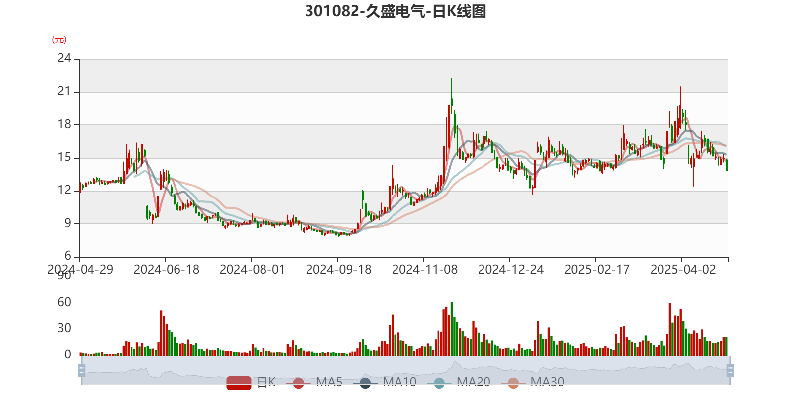以4月25日收盘价计算,久盛电气目前市盈率(TTM)约为-64.66倍,市净率(LF)约3.09倍,市销率(TTM)约1.57倍。